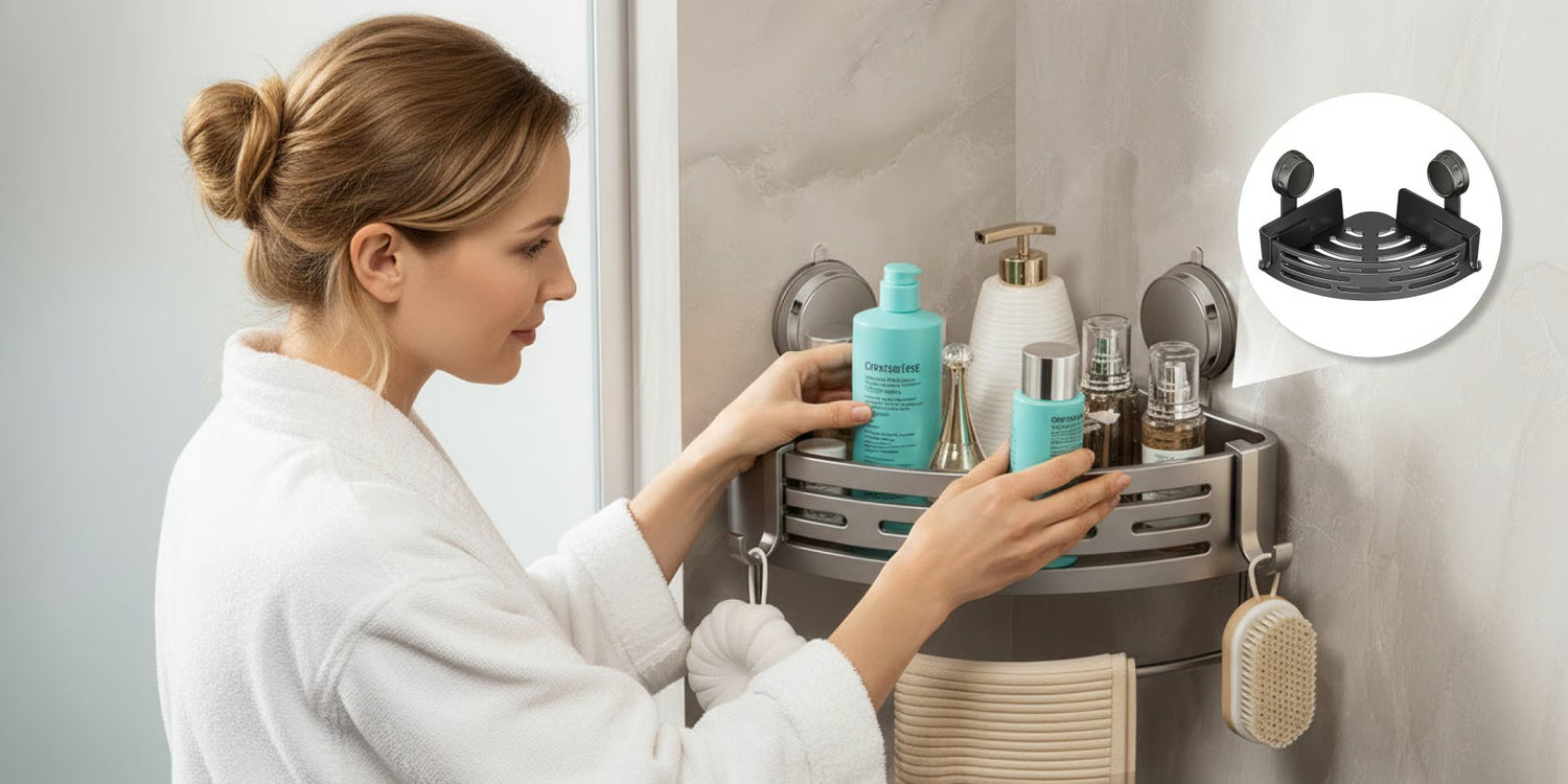 Organizează șamponul și accesoriile în 30 secunde, fără să strici faianța.